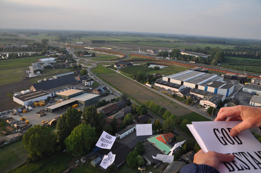 Leaflets with the text GOD DOESN’T EXIST were dispersed from the heavens.